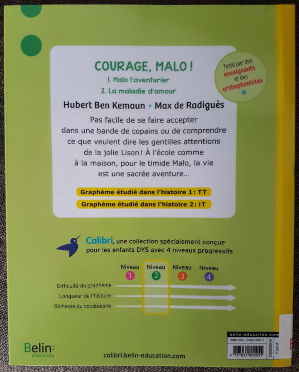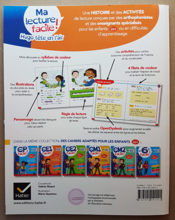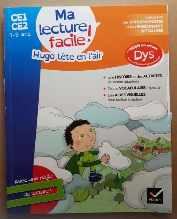 Pour aider mon fils dys, j’ai commencé par “Ma lecture facile !” pour CE1/CE2 de 7 à 9 ans, adapté aux enfants DYS ou en difficulté d’apprentissage. Je voulais d’abord faire un test avant de choisir d’autres collections. J’ai alors commandé “Hugo tête en l’air”, “Ma lecture facile !” chez la maison d’édition Hatier. Le livre coûte 7,50 euros. Je trouve que c’est correct.