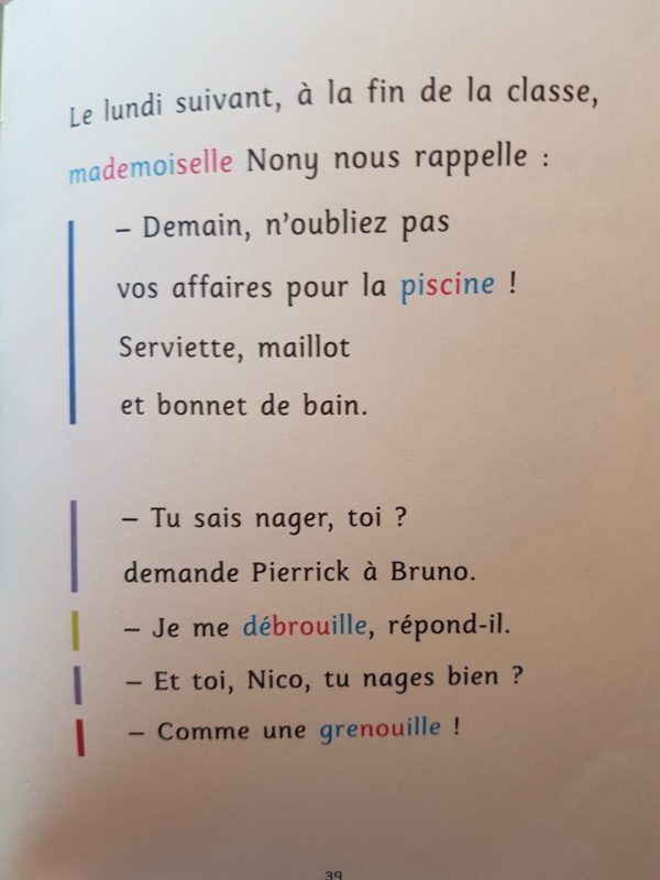 Au niveau du texte, il est aéré, la police utilisée est grosse et très espacée. Les mots longs sont écrits en couleur pour que l’enfant distingue les différentes syllabes à prononcer.